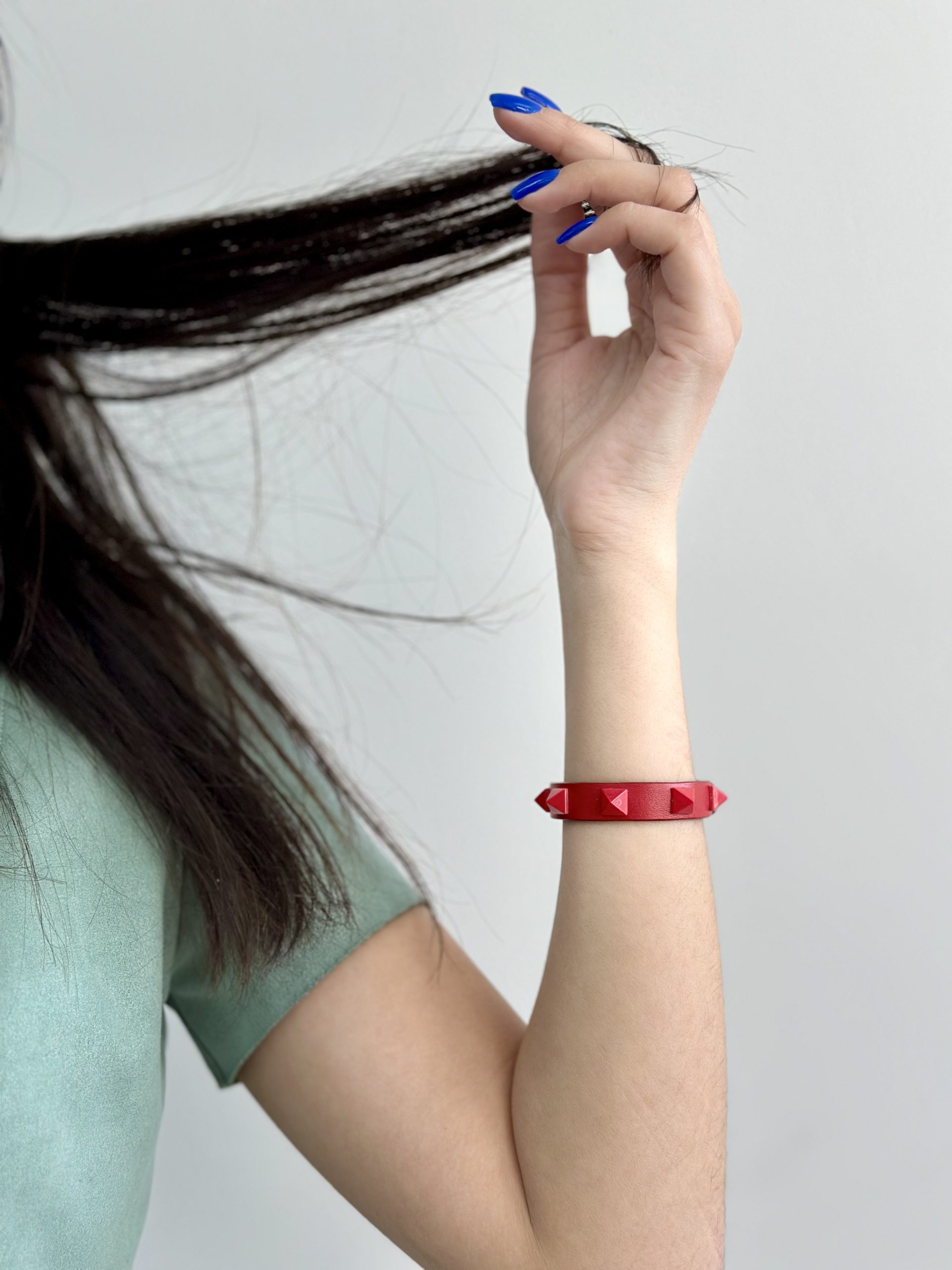 Минималистичная, при этом интересная по форме и лаконичная модель. Браслет в один оборот с шипами в тон кожи.