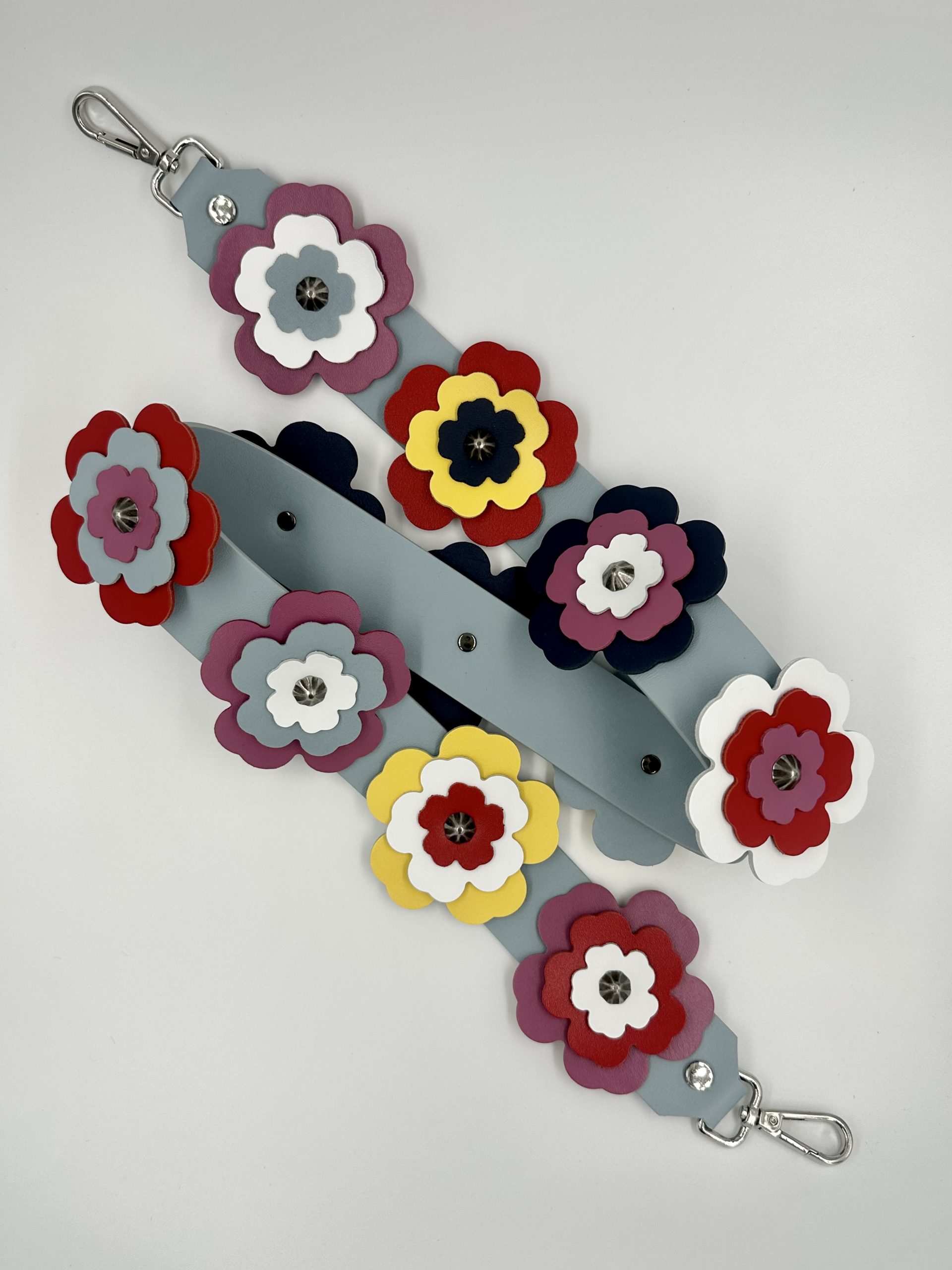 Ремень для сумки из натуральной кожи. Украшен цветами из кожи с металлическими сердцевинками.